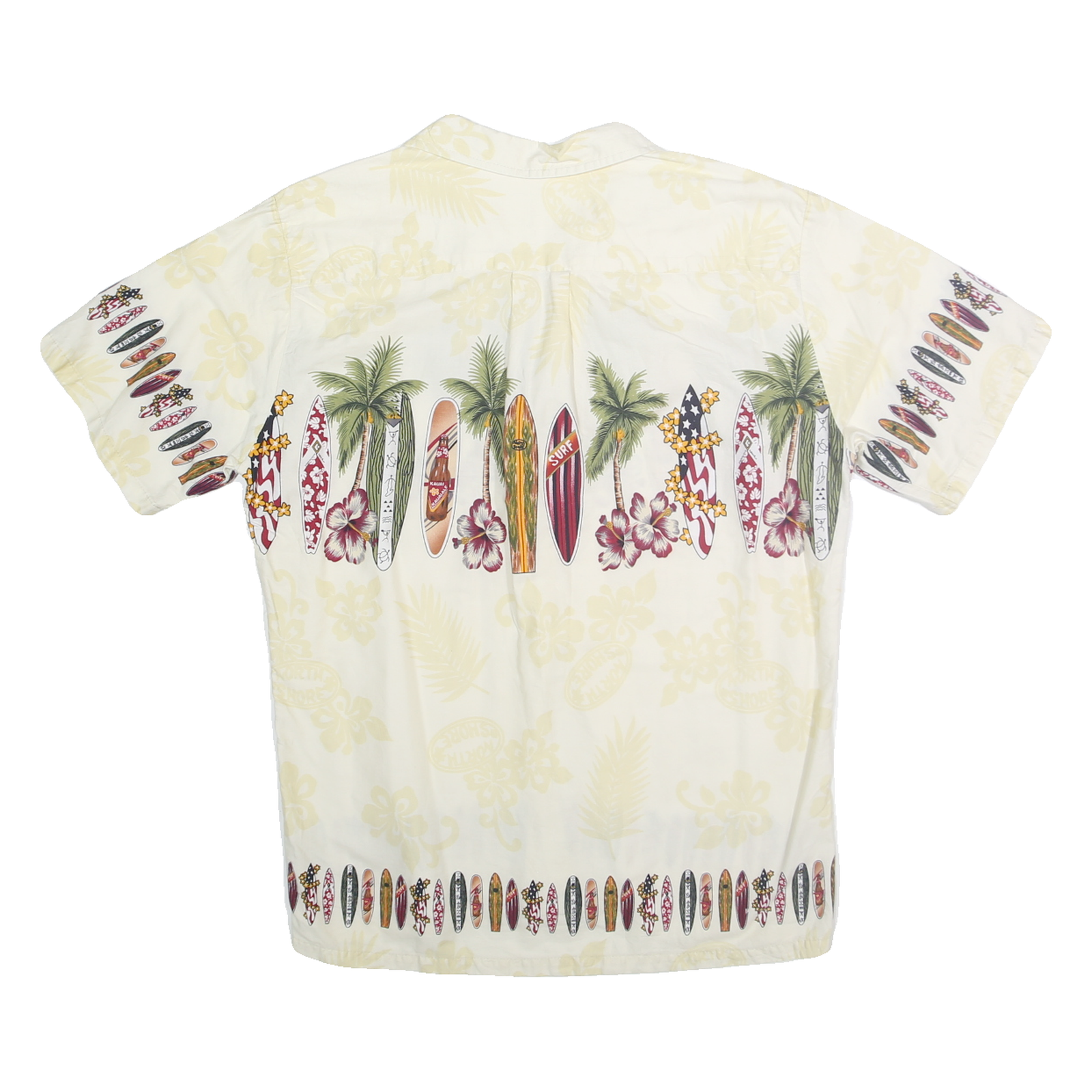 This PALMWAVE mens shirt features a cream base adorned with a vibrant and detailed surfboard print across the chest, back, and sleeves. Palm trees, hibiscus flowers, and surfboards with various colourful patterns including stripes and floral motifs create a classic Hawaiian beach aesthetic. The shirt has a button closure and a classic collar, embodying an easy-going, holiday-ready look.