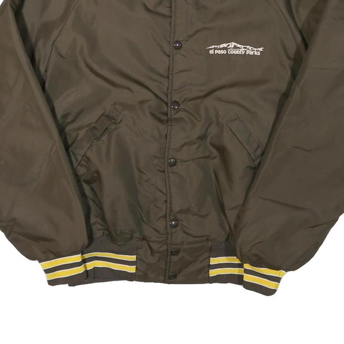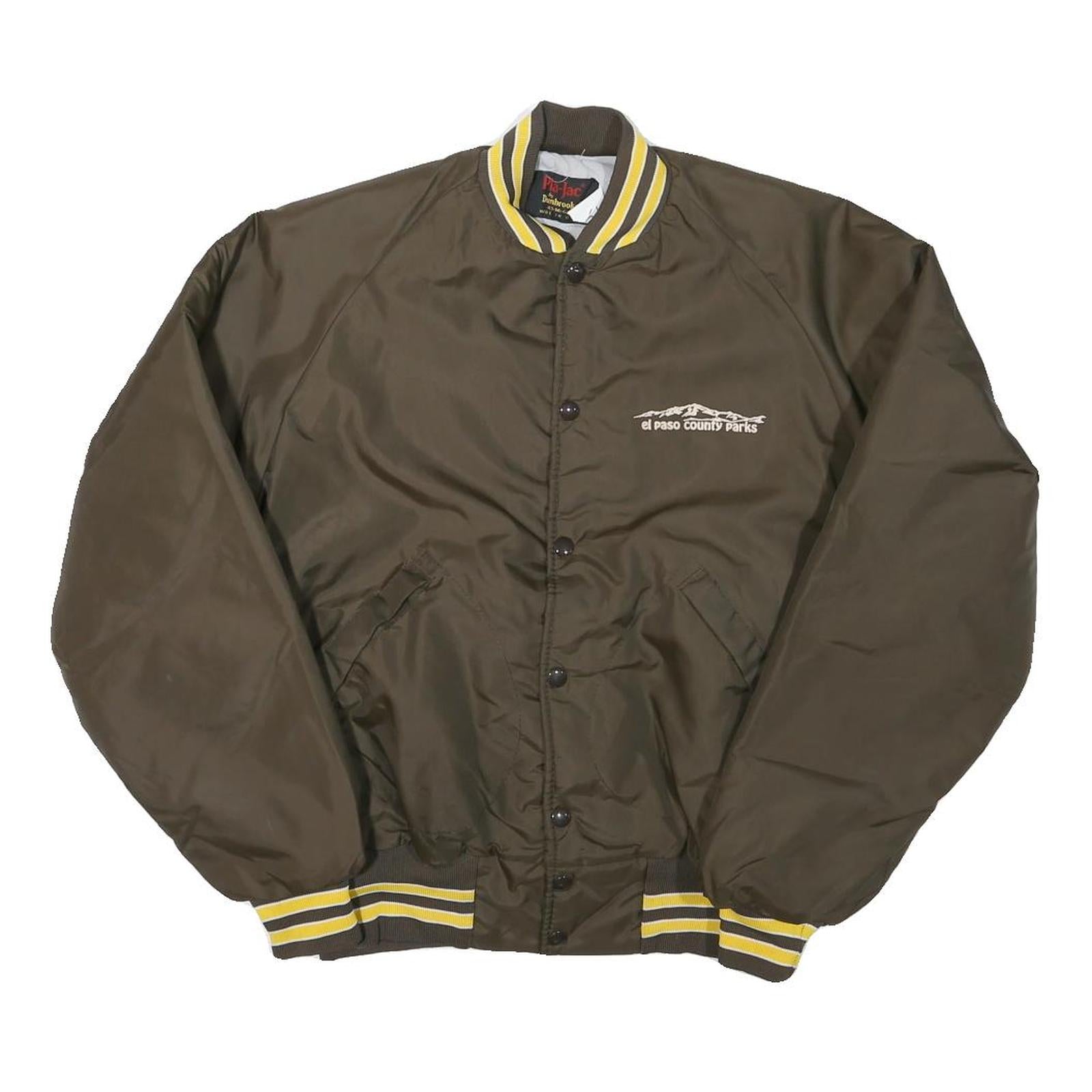 This PLA-JAC mens jacket features a primary brown colour with yellow and brown striped ribbing on the collar, cuffs, and waistband, creating a classic sporty look. The front includes button closures and two angled pockets, while an embroidered logo on the chest reads 'el paso county parks' beneath a stylised mountain graphic.