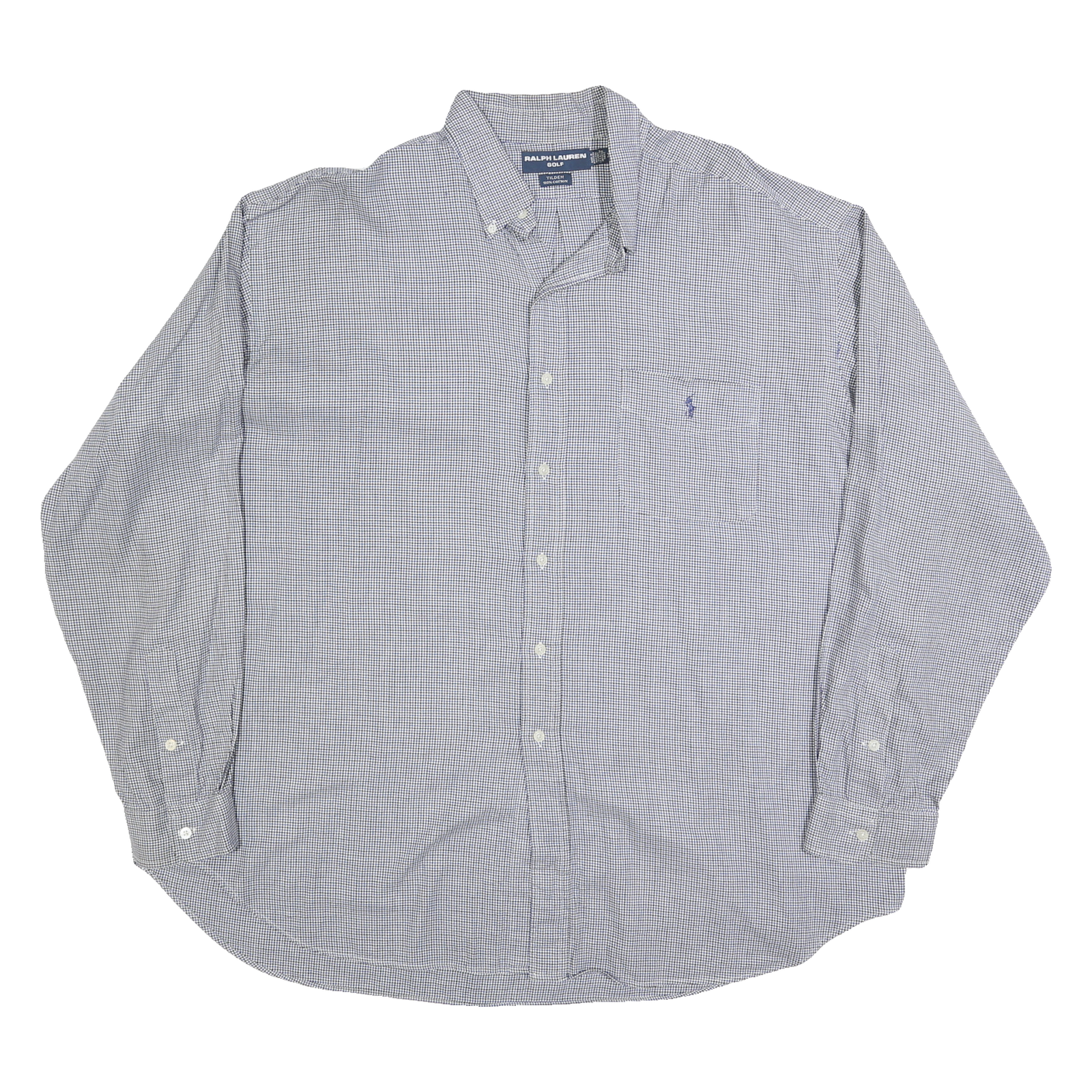 This Ralph Lauren mens shirt features a classic blue and white small checked pattern, presenting a refined and timeless aesthetic. The front has a neat button-down collar and a chest pocket embroidered with the iconic Ralph Lauren pony logo in blue.