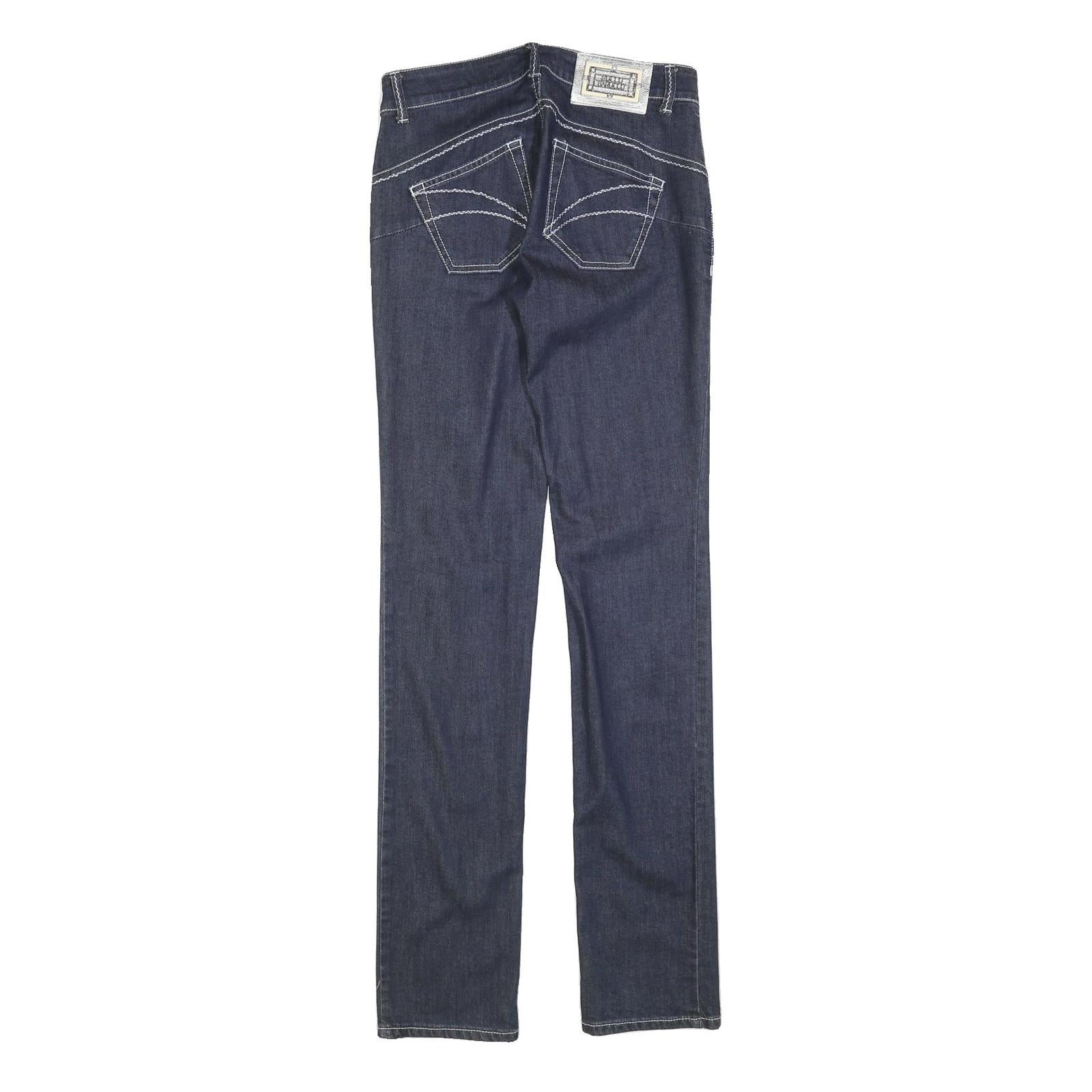 These ROCCOBAROCCO womens jeans feature a deep blue denim colour with contrasting white stitch detailing along the seams and pockets for a chic look. The slim fit and straight leg cut provide a flattering silhouette. The jeans have a traditional five-pocket design with a zip closure and branded button at the waist.