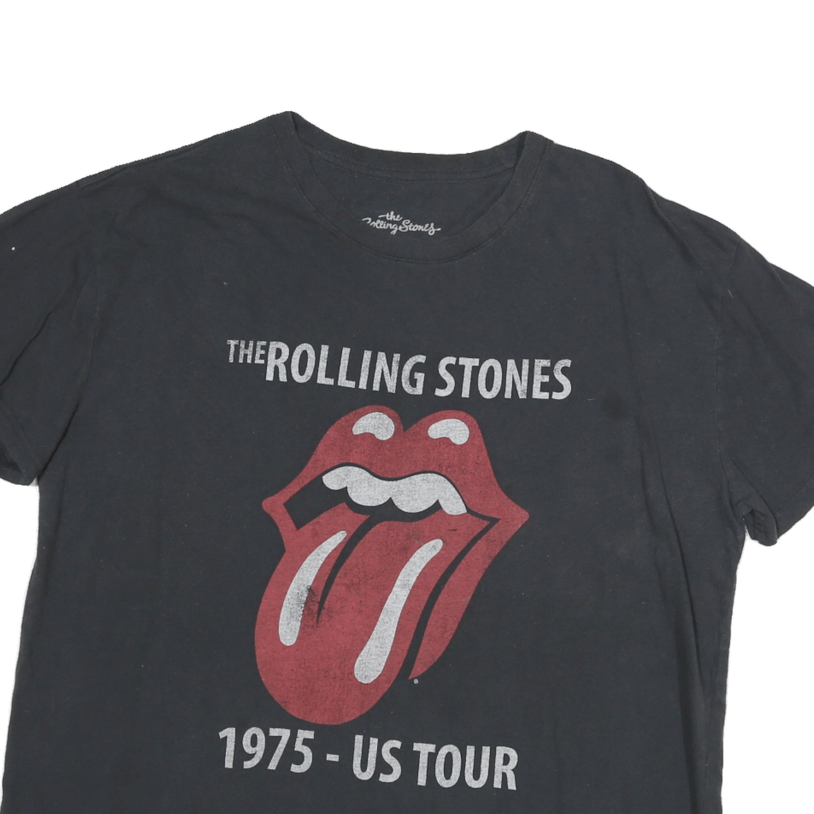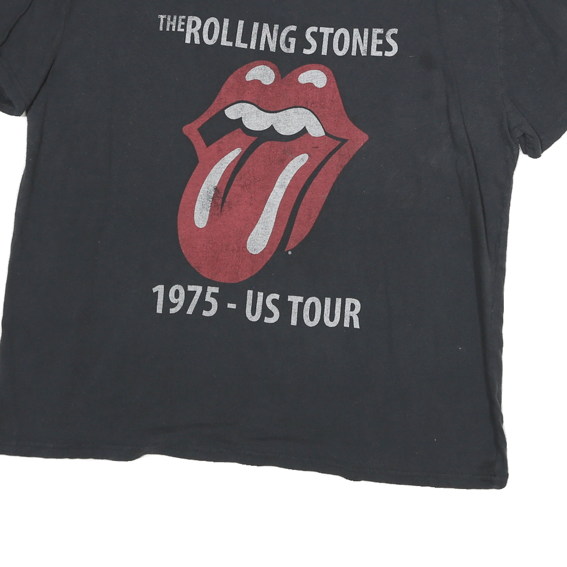 This black Rolling Stones T-shirt features the iconic tongue and lips logo along with 'The Rolling Stones' text and '1975 - US Tour' graphics on the front. The print shows slight wear, adding a vintage character to the design. The shirt has a classic crew neck and short sleeves, creating an easy-to-wear silhouette.