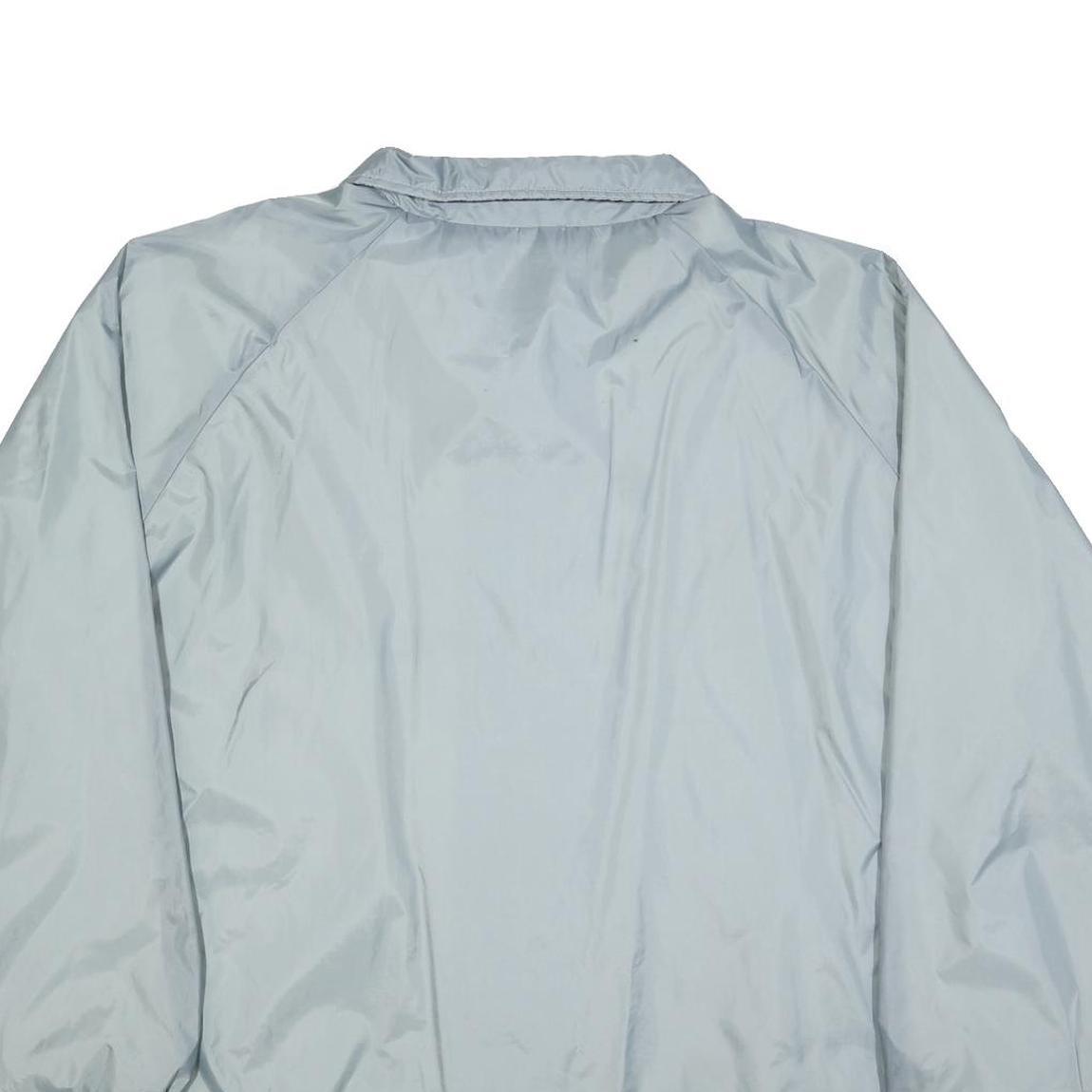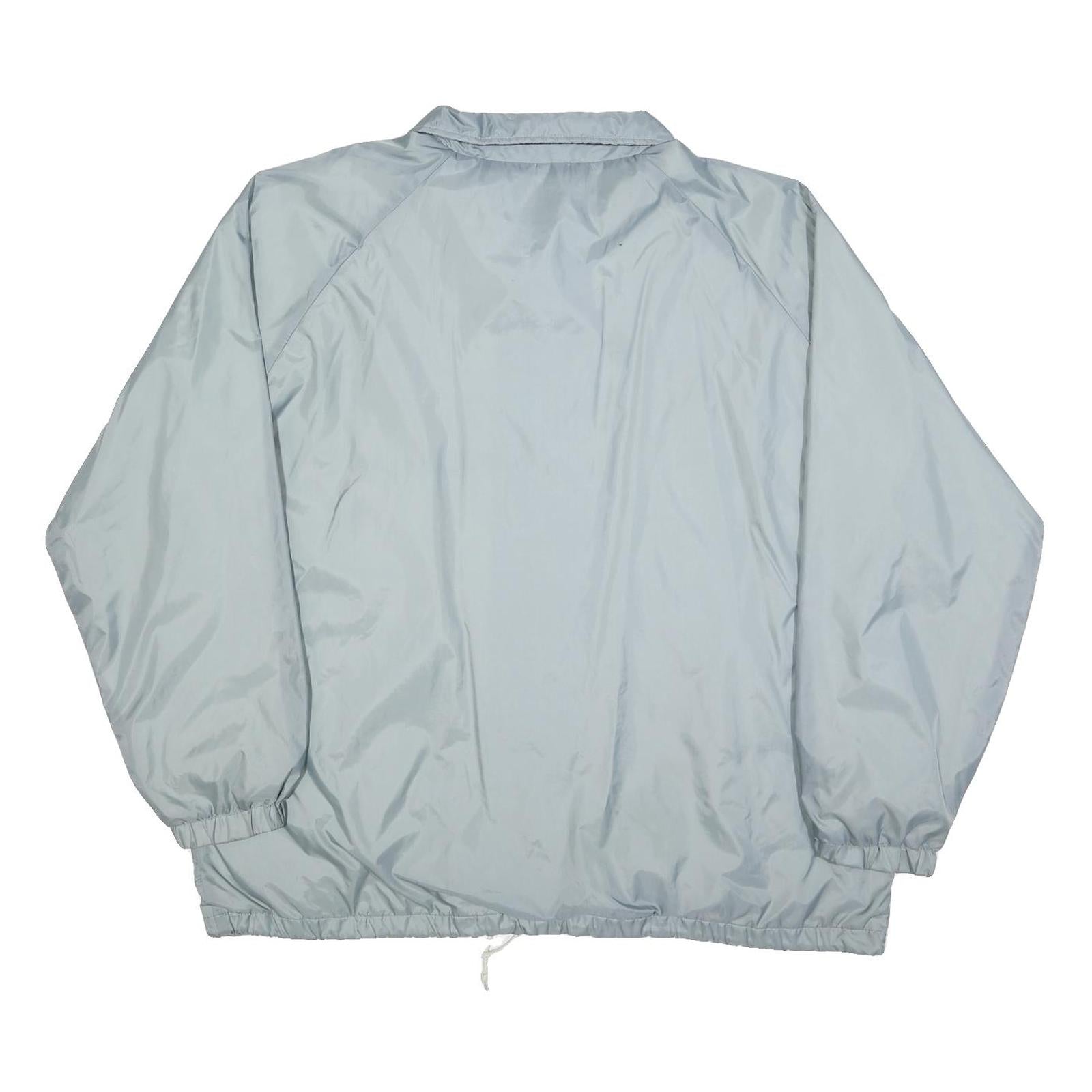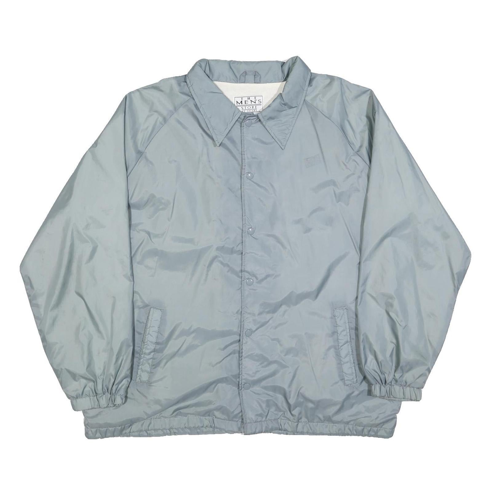 This Sears mens jacket features a smooth grey exterior crafted from a polyester blend fabric, providing lightweight durability and comfort. It fastens with a button closure along the front and has a sharp pointed collar for a classic look. The jacket includes two front pockets and elasticated cuffs and hem for a secure fit and enhanced wind resistance.