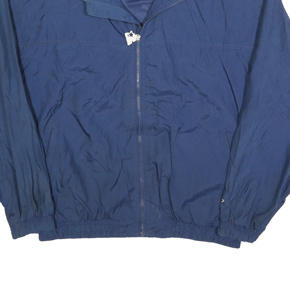 This Mens STARTER jacket features a rich blue colour crafted from a polyester blend fabric that offers a lightweight and comfortable feel. The jacket includes a full zip closure with a star-shaped zipper pull and an elasticated hem and cuffs for a snug fit.