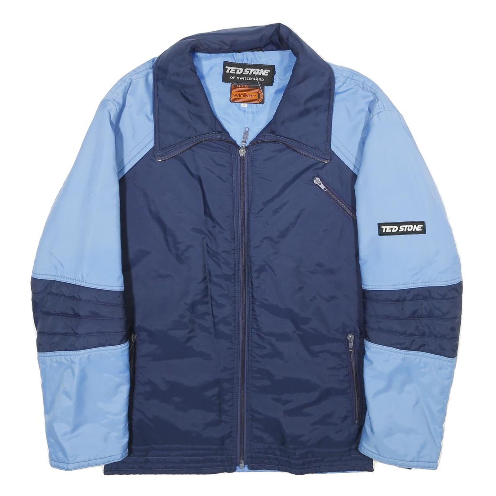 This Ted Stone men's jacket features a striking colourblock design combining blue and navy shades. The jacket has a full zip closure and three zippered pockets including a diagonal chest pocket, offering both style and convenience. A Ted Stone logo patch is prominently displayed on one sleeve, emphasizing brand identity.