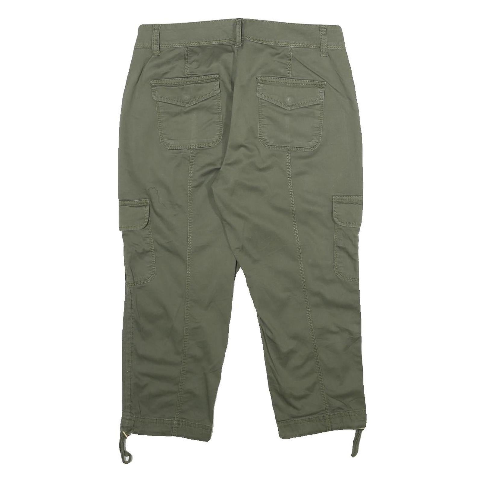 These TIME AND TRU womens shorts are crafted in a muted green colour, ideal for casual wear. Featuring a classic cargo style, they have large flap pockets on both legs and additional pockets at the back and front, adding practical storage space. The shorts close with a button and zip fly and have adjustable ties at the hem for a customised fit.