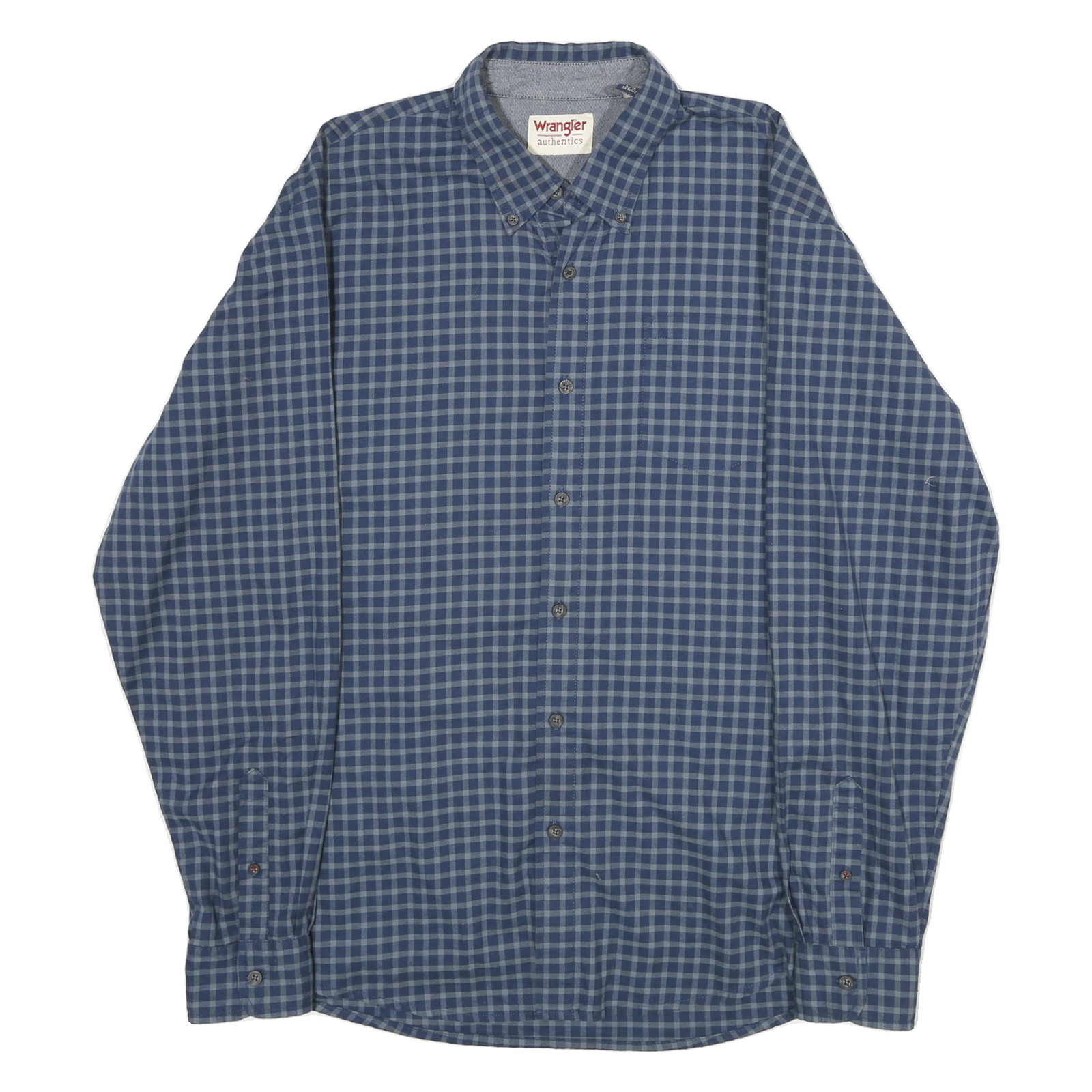 This Wrangler mens shirt features a classic check pattern in shades of blue, adding timeless style suitable for casual or smart-casual occasions. It includes a button-down collar and full button front closure for a neat, traditional look. There is a chest pocket on the left side that blends seamlessly with the check design.