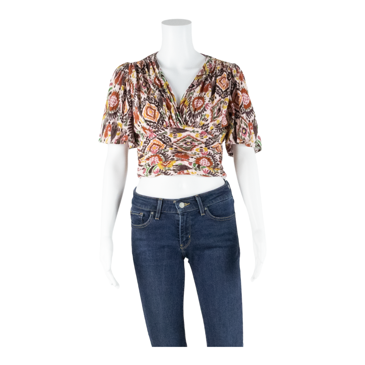 ZARA Womens Cropped Top Pink V-Neck Linen Crazy Pattern S